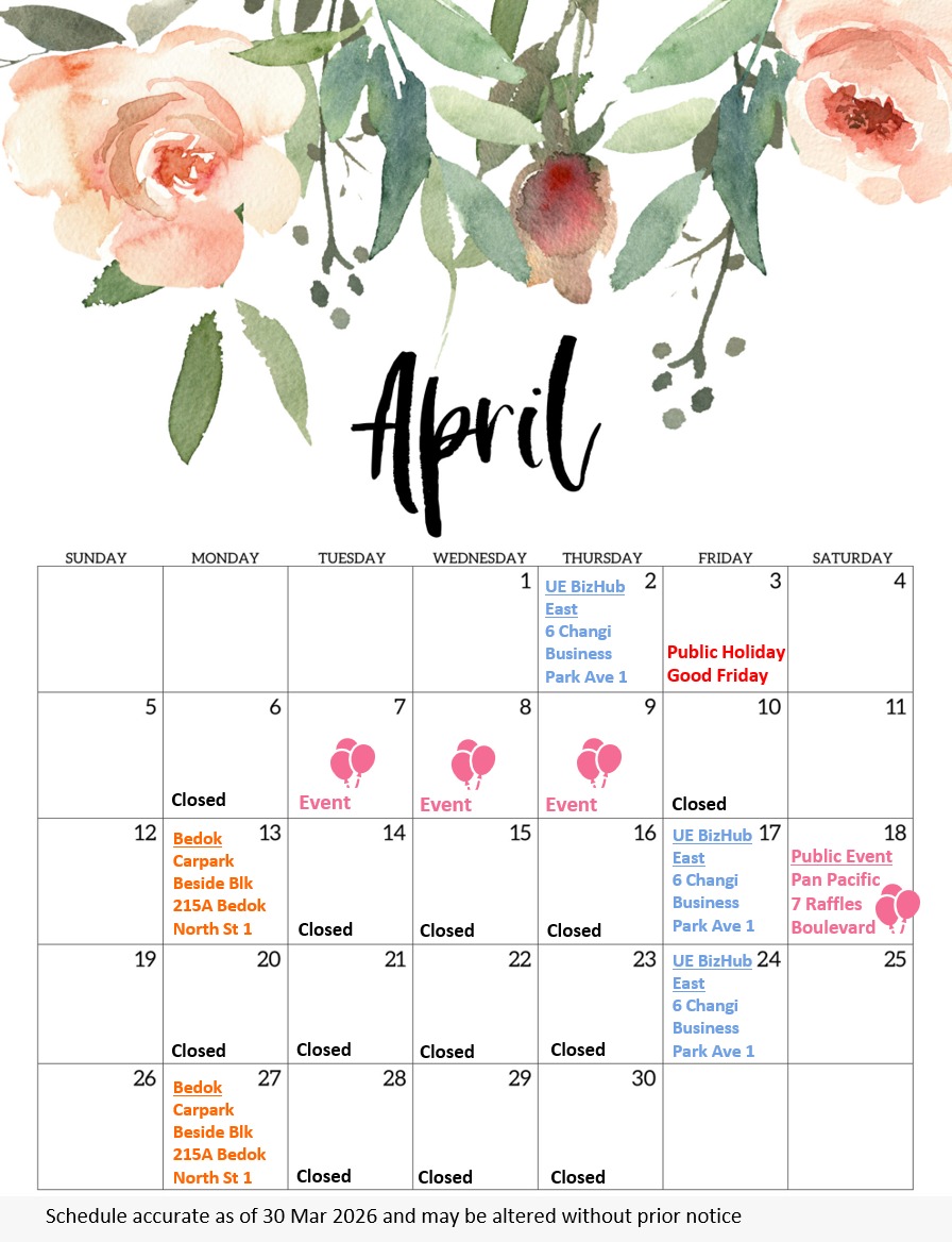Mon & Fri: Carpark beside 215A Bedok North St 1, Singapore 461215 (Heavy Vehicle Carpark), Tue & Thurs: Perennial Business City (Lobby G)